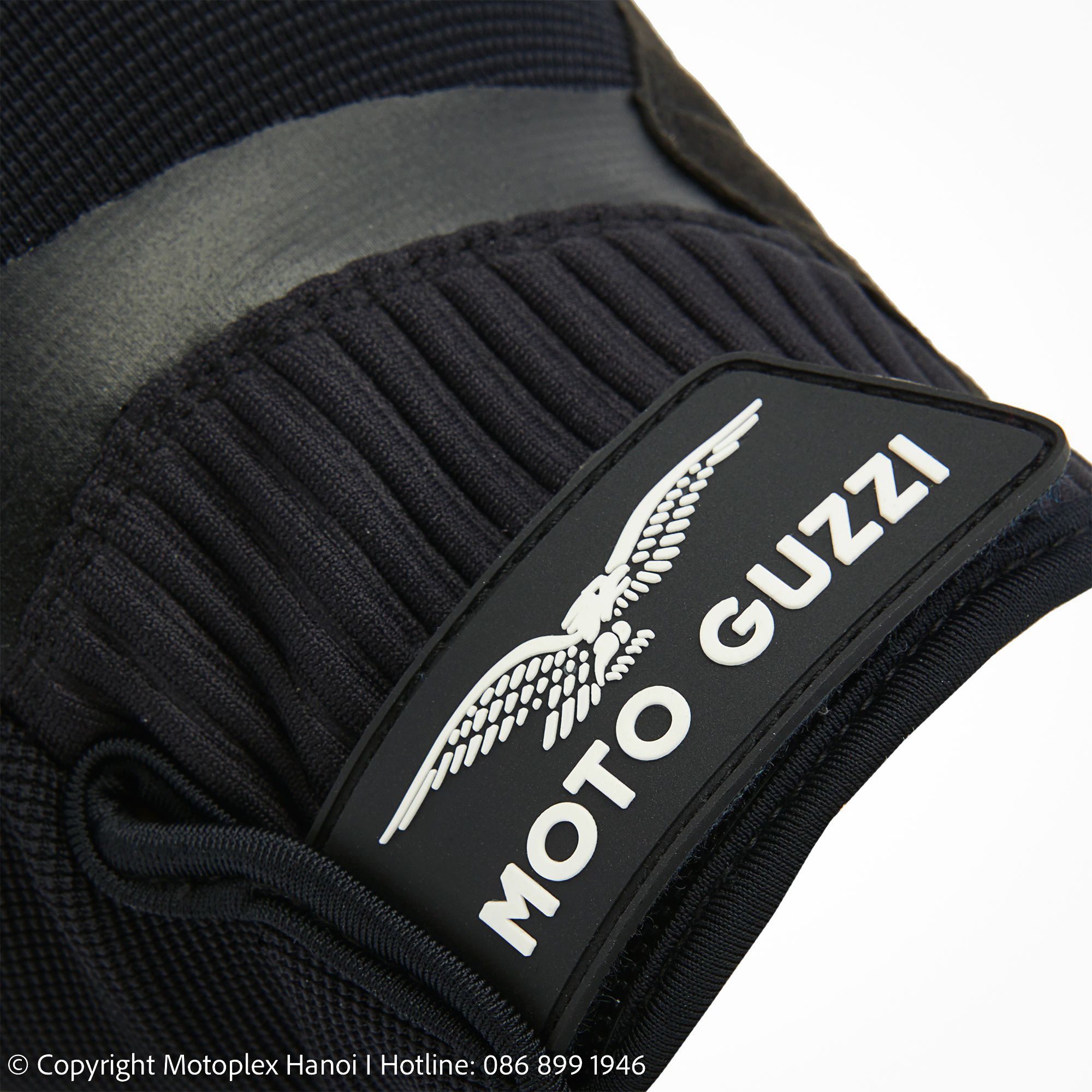 Vải lưới đục lỗ, Vải co giãn. Lòng bàn tay bằng sợi nhỏ da lộn có độ bền cao. Vòng bít cao su tổng hợp có khóa Velcro bảo vệ khớp ngón tay bằng cao su nhiệt dẻo. Logo Moto Guzzi được đính vào ngón trỏ và cổ tay.